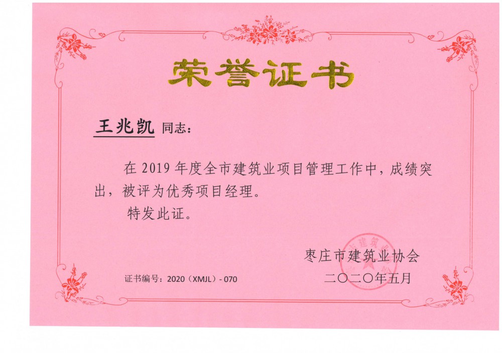 王兆凱-2019年度市級優(yōu)秀施工企業(yè)及項(xiàng)目經(jīng)理